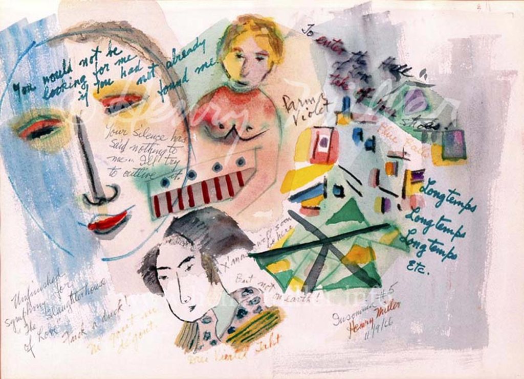 Today is the birthday of Henry Miller (Henry Valentine Miller; Yorkville, Manhattan; December 26, 1891 – June 7, 1980 Pacific Palisades, Los Angeles); writer and watercolor artist. He was known for breaking with existing literary forms, developing a new sort of semi-autobiographical novel that blended character study, social criticism, philosophical reflection, explicit language, sex, surrealist free association and mysticism. His most characteristic works of this kind are Tropic of Cancer (1934), Black Spring (1936), Tropic of Capricorn (1939) and The Rosy Crucifixion trilogy (1949–59), all of which are based on his experiences in New York and Paris, and all of which were banned in the United States until 1961. He also wrote travel memoirs and literary criticism, and painted watercolors.