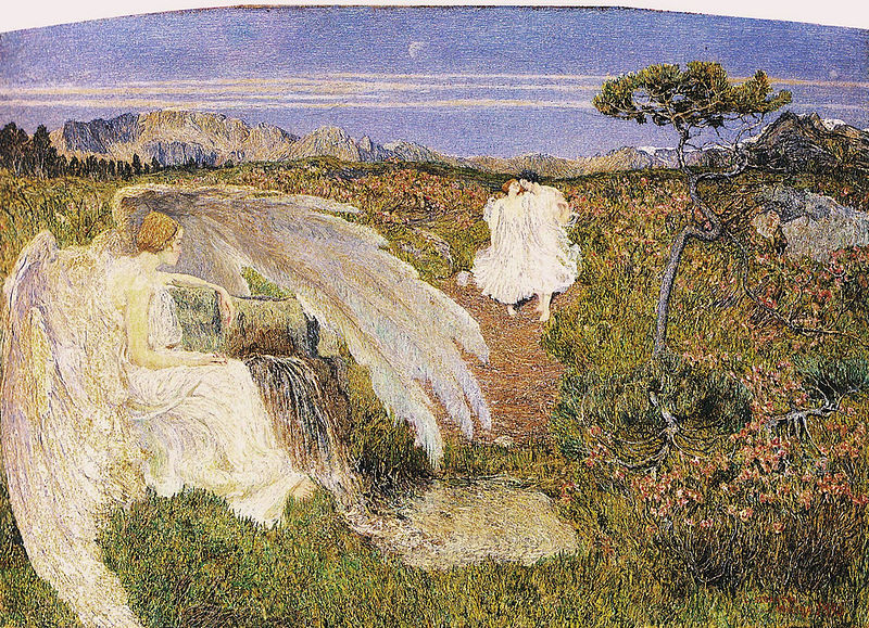 And today is the birthday of Giovanni Segantini (Arco, Trentino, Austrian Empire 15 January 1858 – 28 September 1899 Pontresina, Graubünden, Switzerland); painter known for his large pastoral landscapes of the Alps.  He was one of the most famous artists in Europe in the late 19th century, and his paintings were collected by major museums.  In later life he combined a Divisionist painting style with Symbolist images of nature.