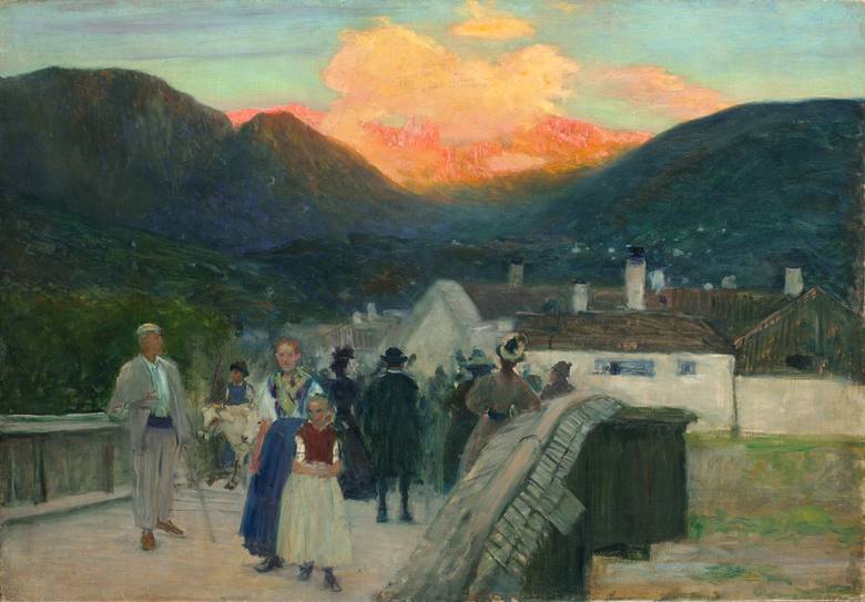 Dorf- und Stadtbewohner auf einer Brücke bei Alpenglühen, Öl auf Leinwand