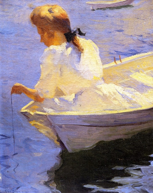 Today is the birthday of Frank Weston Benson, (Salem, Mass. March 24, 1862 – November 15, 1951 Salem, Massachusetts); artist perhaps best known for his Realistic portraits, American Impressionist paintings, watercolors and etchings. He began his career painting portraits of distinguished families and murals for the Library of Congress. Some of his best known paintings (Eleanor, Museum of Fine Arts, Boston; Summer, Rhode Island School of Design Museum) depict his daughters outdoors at Benson’s summer home, Wooster Farm, on the island of North Haven, Maine. He also produced numerous oil, wash and watercolor paintings and etchings of wildfowl and landscapes.
