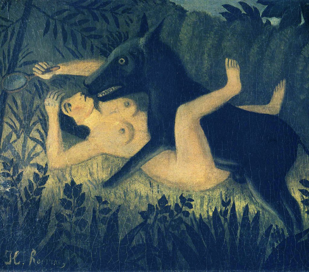 Today is the birthday of Henri Rousseau (Henri Julien Félix Rousseau; Laval, France; May 21, 1844 – September 2, 1910 Paris); Post-Impressionist painter in the Naïve or Primitive manner. He was also known as Le Douanier (the customs officer), a humorous description of his occupation as a toll collector. Ridiculed during his lifetime by critics, he came to be recognized as a self-taught genius whose works are of high artistic quality. Rousseau’s work exerted an extensive influence on several generations of avant-garde artists. Sylvia Plath was an admirer of Rousseau, referencing his art, as well as drawing inspiration from his works in her poetry. The poem, “Yadwigha, on a Red Couch, Among Lilies” (1958), is based upon his painting, La Rêve, whilst the poem “Snakecharmer” (1957) is based upon his painting The Snake Charmer. The song, “The Jungle Line”, by Joni Mitchell from her album The Hissing of Summer Lawns, is based upon a Rousseau painting.
