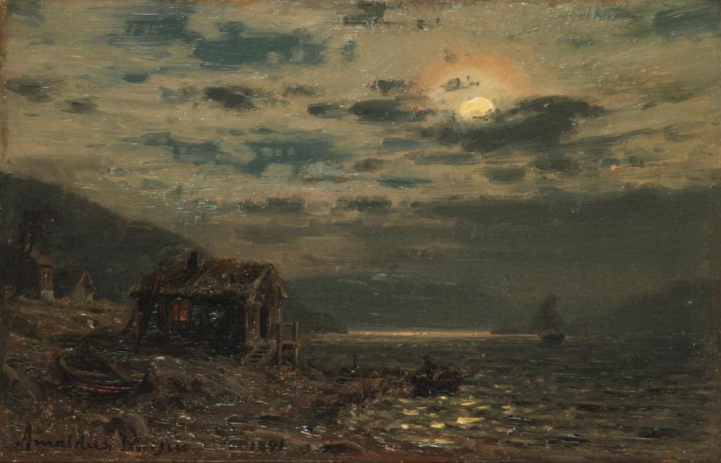 Today is the birthday of Amaldus Nielsen (Amaldus Clarin Nielsen; Halse, Norway; 23 May 1838 – 10 December 1932 Oslo); painter. He painted in the naturalist style, and has been called “Norway’s first naturalist painter”. Important paintings include Hvalørhei (1874), Skovbillede (1896), Morgen ved Ny-Hellesund (1885, one of several from Ny-Hellesund), Ensomt sted (1901), Fra Bankefjorden (1910) and Kveld på Jæren (1925). Most of his paintings portrayed Western and Southern Norway, but also Østfold.