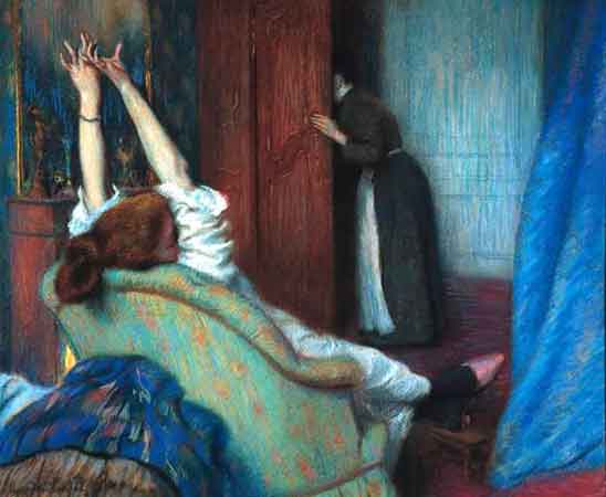 A virtuoso, he achieved successes alike in watercolour, pastel, oil and etching, both in portraiture, in landscape and in decoration. His close analysis of light can be studied in his picture La femme qui se chauffe at the Luxembourg in Paris, one of a large group of nude studies of which a later example is Une Nymphe au bord de la mer; and in the work produced during and after a visit to India in 1911. A large panel, Peace by Arbitration, was completed seven days before the outbreak of war in 1914.