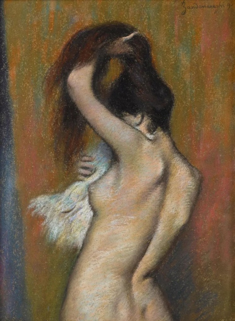 In 1874, he went to Paris, where he was to spend nearly the rest of his life. He quickly made the acquaintance of the Impressionists, who had just had their first group exhibition. Zandomeneghi, whose style of painting was similar to theirs, would participate in four of their later exhibitions, in 1879, 1880, 1881, and 1886. To supplement the meager returns from the sale of his paintings, Zandomeneghi found work drawing illustrations for fashion magazines.