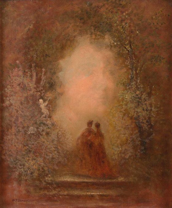 Though at one time his name was mentioned alongside other great American painters such as Sargent and Whistler, Dannat’s popularity was more in Europe than his homeland. As he approached middle age, the financially secure artist began to devote more and more of his time to other interests: fencing, boxing and later automobile racing. For nearly twenty years, Dannat ceased painting and when he resumed around 1913, his art had adopted a more surrealistic style with illusionary landscapes and bizarre themes. During his hiatus from painting, Dannat spent much of his time touring Europe studying the techniques of the great masters while remaining active in artistic circles in Paris where he served at one time as the president of the Society of American Painters.