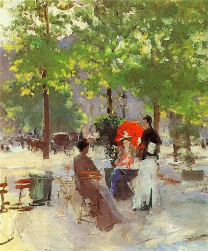 One of the artist’s favourite themes was Paris. He painted A Paris Cafe (1890s), Cafe de la Paix (1905), La Place de la Bastille (1906), Paris at Night, Le Boulevard Italien (1908), Night Carnival (1901), Paris in the Evening (1907), and others.
