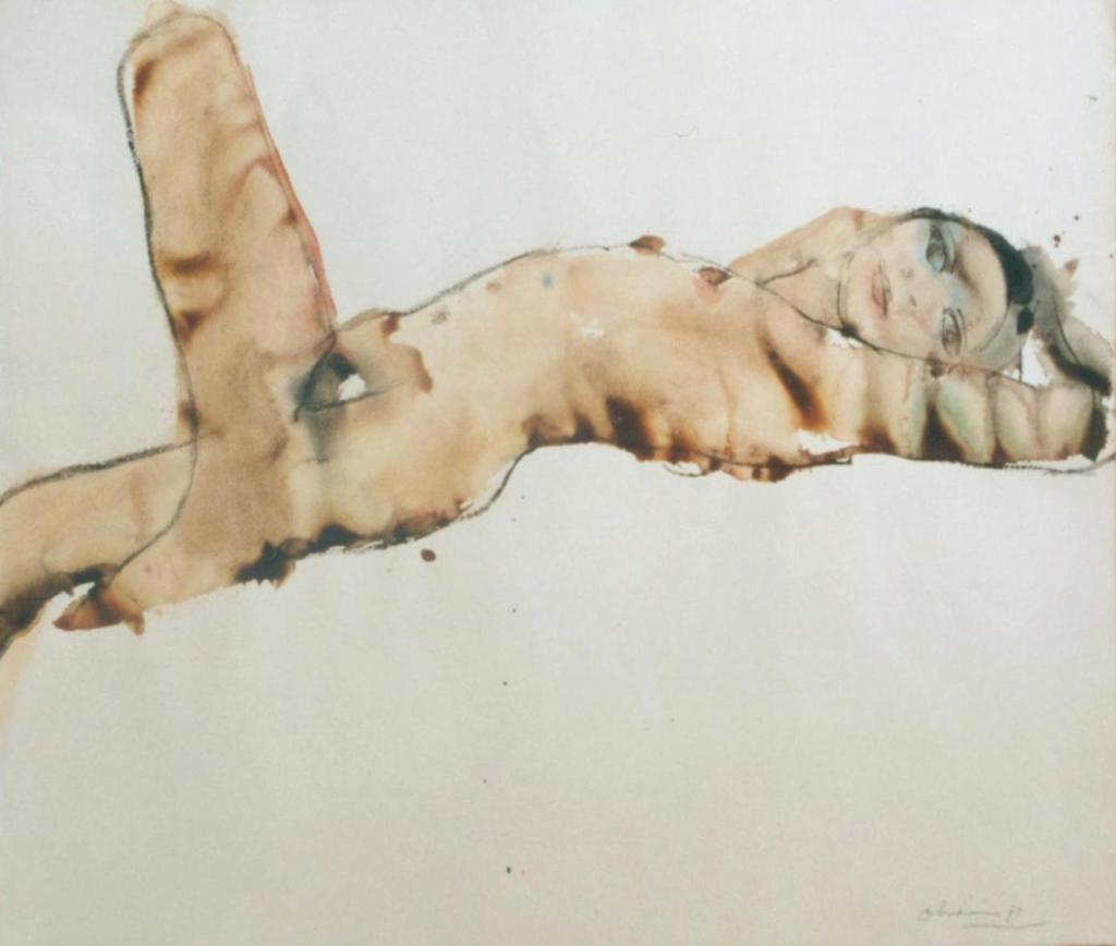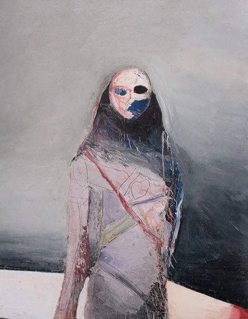 Oliveira established an early reputation for his depictions of isolated figures painted in an improvisational style. Over time his subjects and style varied as he created images of animals, birds of prey, human heads, masks, nudes, and still lifes of fetish objects. Oliveira also developed a series of “sites” that told the story of an invented culture with shamanic characteristics. Most of the artist’s paintings are either vividly colored but somber human figures, or abstract expressionist works that vaguely resemble seascapes. Sea from 1959, in the collection of the Honolulu Museum of Art, is an example of these almost abstract seascapes.