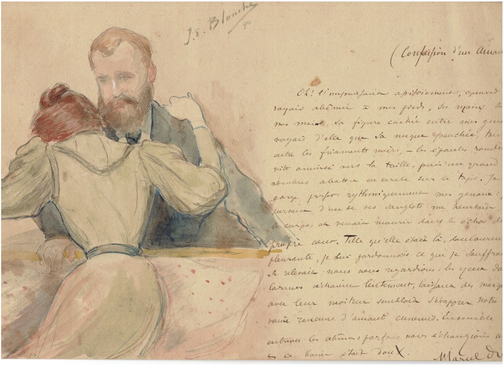 Blanche was well known in Parisian society to be homosexual, though closeted. After the Oscar Wilde trials he married Rose Lemoinne, daughter of John Lemoinne the journalist, publisher and editor of the influential Parisian newspaper Journal des Débats. The marriage was never consummated. One of his lovers may have been the Spanish painter Rafael de Ochoa, whom Blanche wrote shared the “same tendencies”, and features with him in a self-portrait. Blanche died at his home and was interred in the 2nd section of Passy Cemetery.