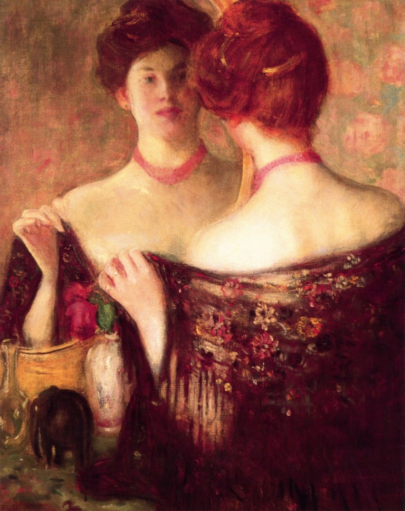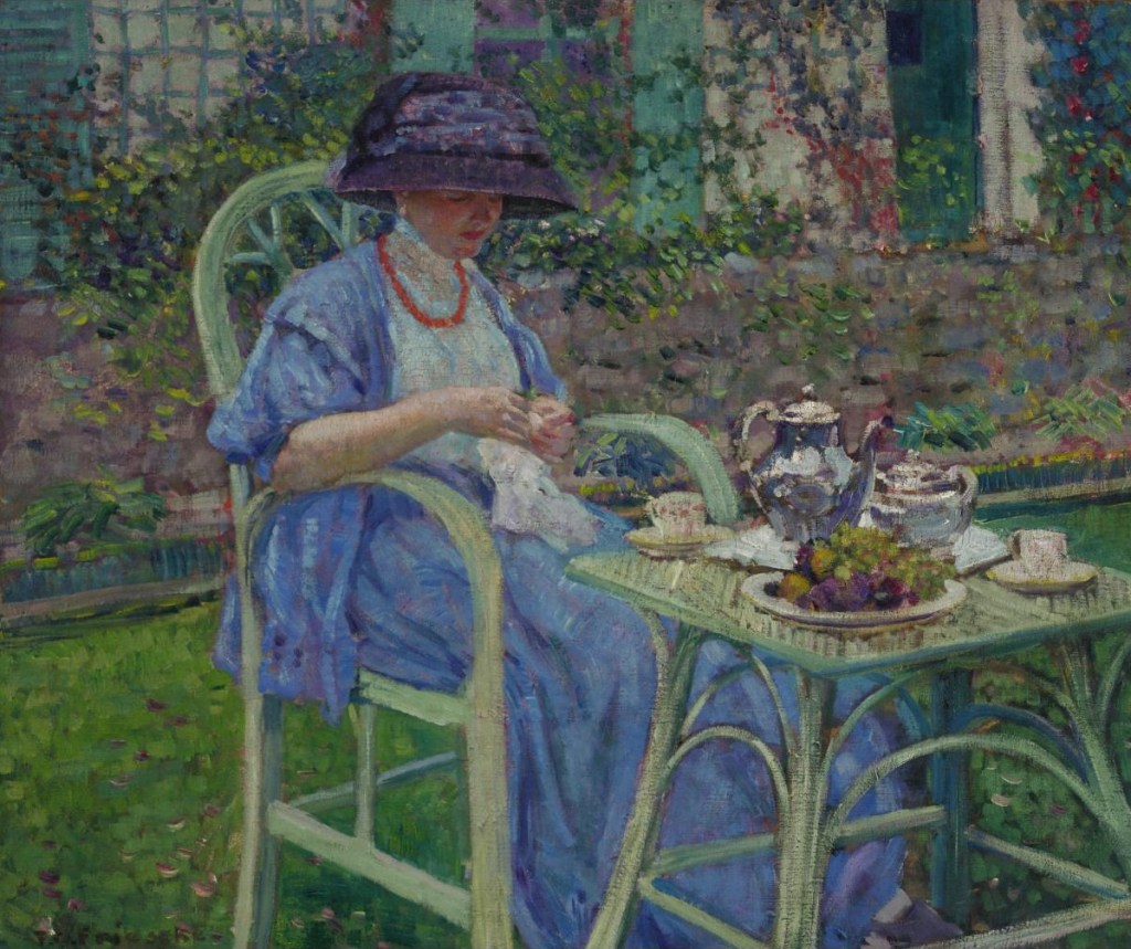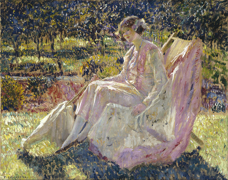 Today is the birthday of Frederick Carl Frieseke (Owosso, Michigan April 7, 1874 – August 24, 1939 Normandy); Impressionist painter who spent most of his life as an expatriate in France. An influential member of the Giverny art colony, his paintings often concentrated on various effects of dappled sunlight. He is especially known for painting female subjects, both indoors and out.