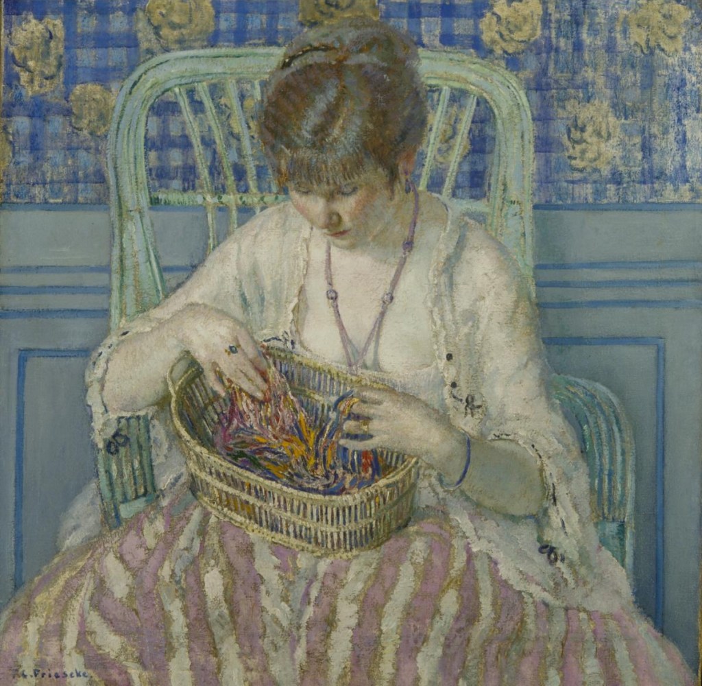 In 1898 he moved to France, where he would remain, except for short visits to the United States and elsewhere. In October 1905 he married Sarah Anne O’Bryan (known as Sadie), whom he had met seven years earlier. They spent every summer from 1906 to 1919 in Giverny. He kept a Paris apartment and studio throughout his life, and the Friesekes spent the winters in Paris. Their Giverny house, previously the residence of Theodore Robinson, was next door to Claude Monet’s. Despite the proximity, Frieseke did not become close friends with Monet, nor was Monet an artistic influence. He said in an interview, “No artist in [the impressionist] school has influenced me except, perhaps, Renoir.” Indeed, Frieseke’s paintings of sensually rounded figures often bear a resemblance to those of Renoir.